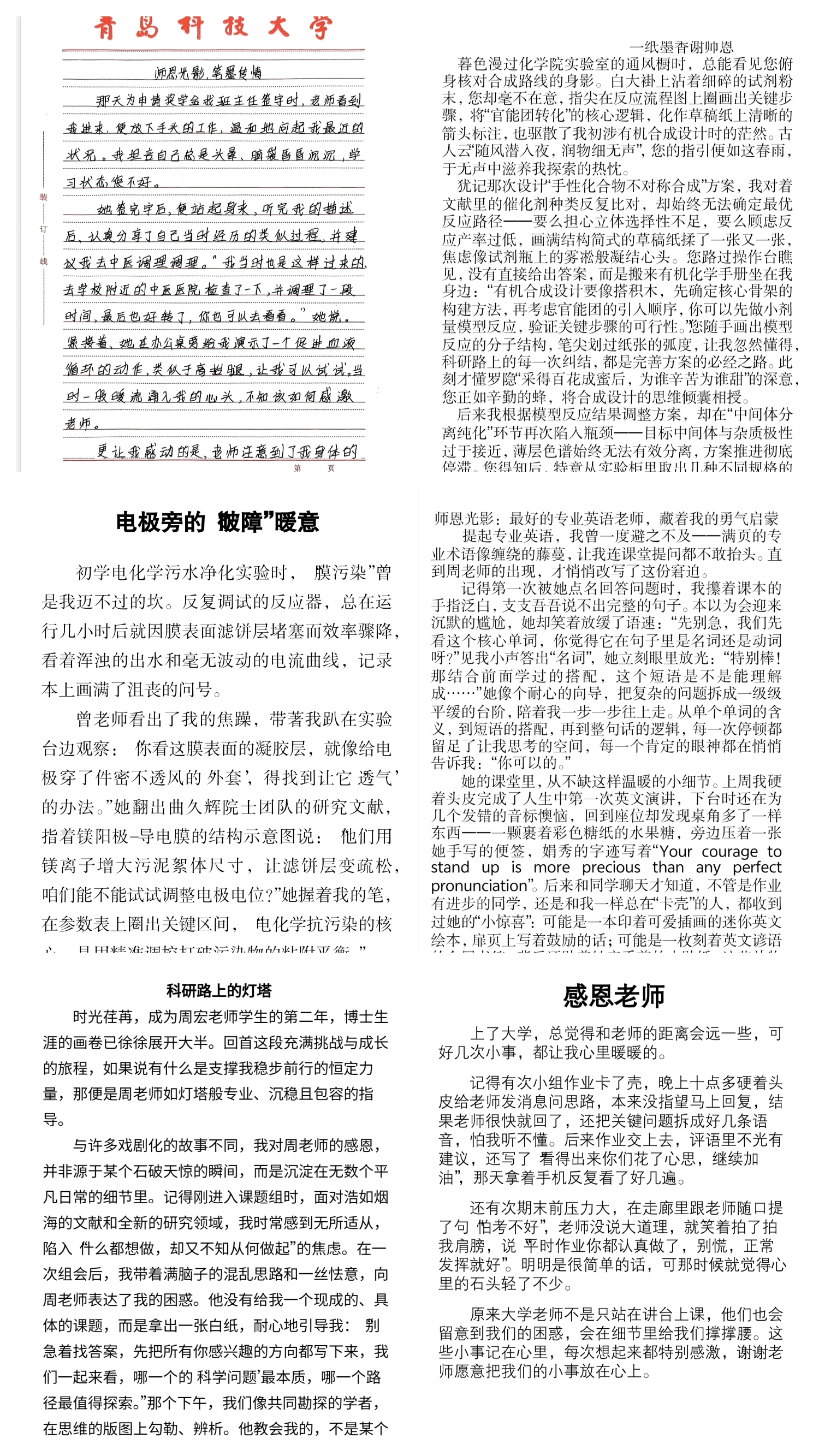 文字是传递情感的信使,“温情短文”活动中,同学们将对老师的感恩与眷恋,都写进了字里行间。老师们不仅在学术上倾囊相授,更在人生道路上为员工拨开迷雾,他们的关怀如春风化雨,润物无声,深刻影响着学子们的成长轨迹与人格塑造。温情的短文,是对老师日常笔墨批注的回应,笔墨往来之间,藏在文字里的师生情有了双向奔赴的温度。