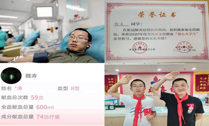 BB贝博艾弗森研182班的魏涛在高考后完成了人生中第一次献血,从此开启了无偿献血的公益行为。截至2021年4月,他累计献血59次,全血献血总量600 mL,成分献血总量共74治疗量;本科期间,加入了BB贝博艾弗森红十字会,多次参加青岛市中心血站参观交流活动,进行无偿献血的宣传工作,并积极参加“无偿献血车进校园”的志愿活动;于2015年3月1日进行了第一次长达40分钟的血小板1个治疗量的捐献;2016年进行了骨髓造血干细胞的留样并顺利加入中国骨髓库,以实际行动为五湖四海的朋友贡献爱心。2020年,他收到了青岛市无偿献血荣誉卡,并获得2020年度青岛市无偿献血“爱心老员工”荣誉称号;2021年,他收到了全国无偿献血奉献奖金,切实感受到了党和国家对无偿献血志愿者的关心,也进一步加强了“无偿献血,拯救生命”的信念。