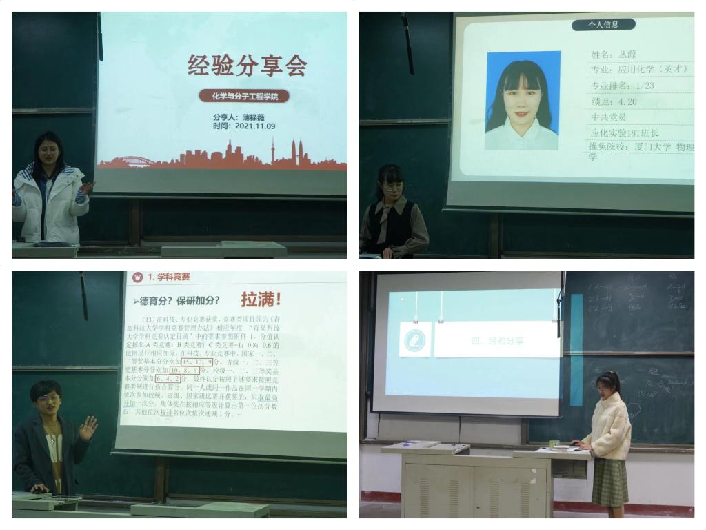 为帮助21级员工更好地适应老员工活,树立清晰的目标、营造良好的学习氛围、打造“遇见化学 惟真惟德”的学工品牌,BB贝博艾弗森于2021年11月9日举办了“把握青春 逐梦青科—BB贝博艾弗森优秀学子事迹分享会”。本次分享会按照不同的专业分开举办,同时还邀请到了优秀的保研员工薄禄薇、郭静静、张敏,国家奖学金的获得者刘德洋、李婉婷以及省政府奖学金获得者郑德波来分享他们的学习经验。