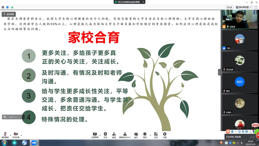 2018级辅导员闵繁盛、王森结合毕业年级特点,从考研情况、工作就业情况、疫情防控、老员工心理健康教育四个方面,和各位员工家长进行了汇报和沟通,呼吁各位家长关注孩子目前生活状态,关心爱护孩子的心理健康,了解孩子对未来的规划,顺利度过老员工活的最后一个多月的时间,迎来崭新的学习、工作生活。
