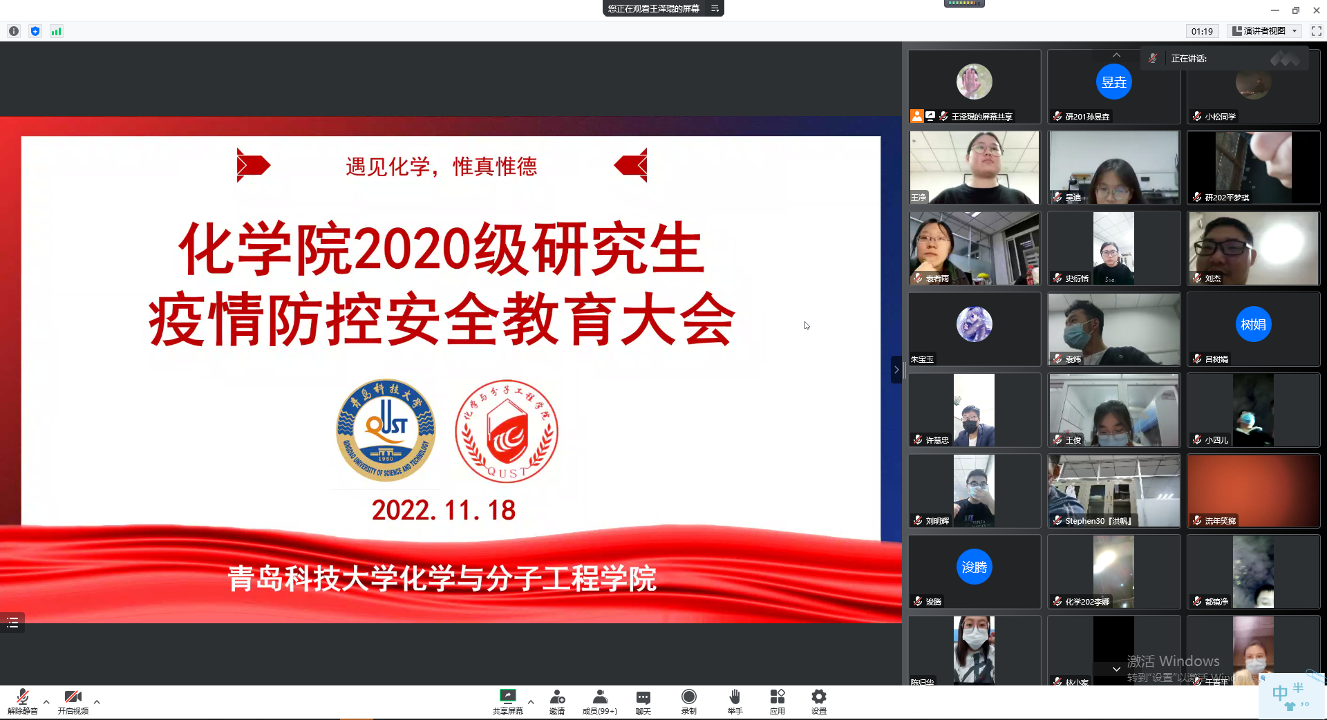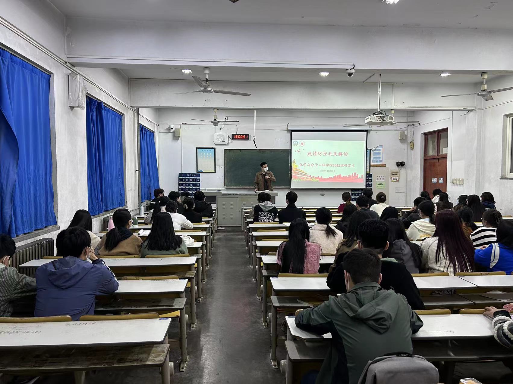 11月18日晚、11月19日上午,辅导员闵繁盛分别在一教308、三教405、三教407为全体22级研究生开展疫情防控安全教育大会。闵老师从高校群体的特性、国家政策引导和目前青岛市疫情形势,就近期疫情防控工作和同学们进行解读,同时解答了目前公司核酸设备的情况,就目前的请假制度进行解读。同时宣传公司“接诉即办”平台。提醒同学们积极准备线下考试,展现良好的考风考纪。强调班级要构建团结友爱积极向上的班级氛围,同时要求班委及各党员同志发挥头雁、纽带和模范作用。引导同学们强化自身职业生涯规划,关注科研。