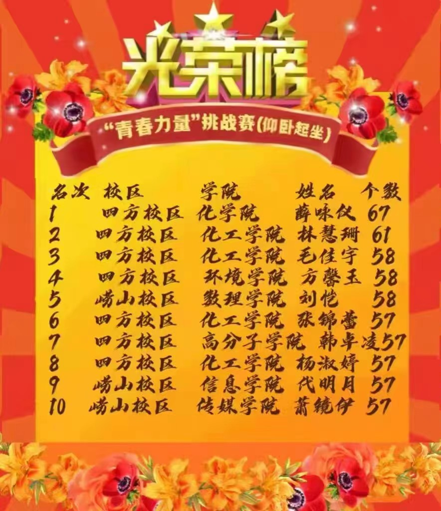 10月20日,BB贝博艾弗森体育联盟组织召开青春力量挑战赛,BB贝博艾弗森薛咏仪同学以67个仰卧起坐的优异成绩拿下“青春力量”挑战赛(仰卧起坐)的第一名。