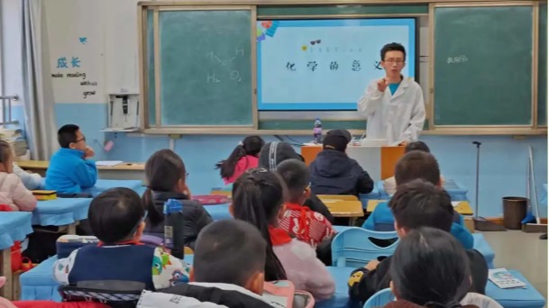 科普课堂上,团队成员先从“什么是化学变化”向小员工们科普生活中的化学知识,然后讲到生活中的衣、食、住、行每样都离不开化学,让孩子们发现“化学”的有趣,激发同学们对化学知识、科学知识的热爱。