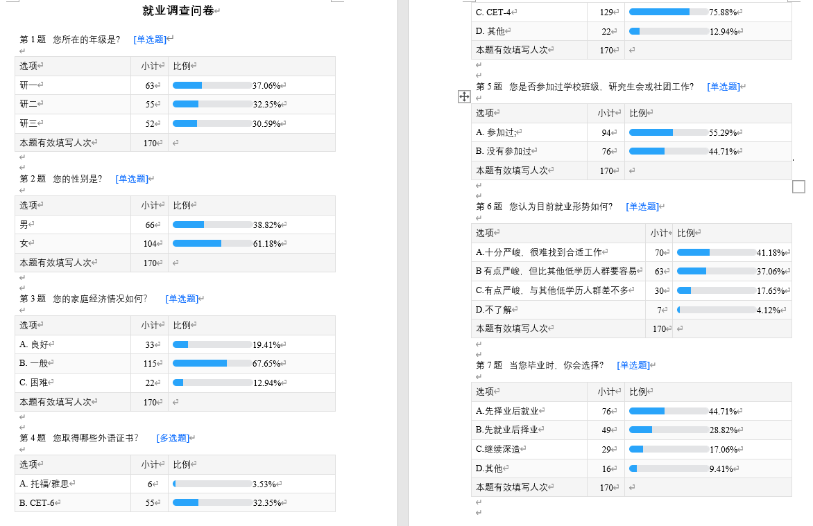 本次就业调查活动收获了170份数据,占比BB贝博艾弗森在读硕士研究生的半数左右,可以体现BB贝博艾弗森全体研究生对就业相关问题的看法。其结果如下: