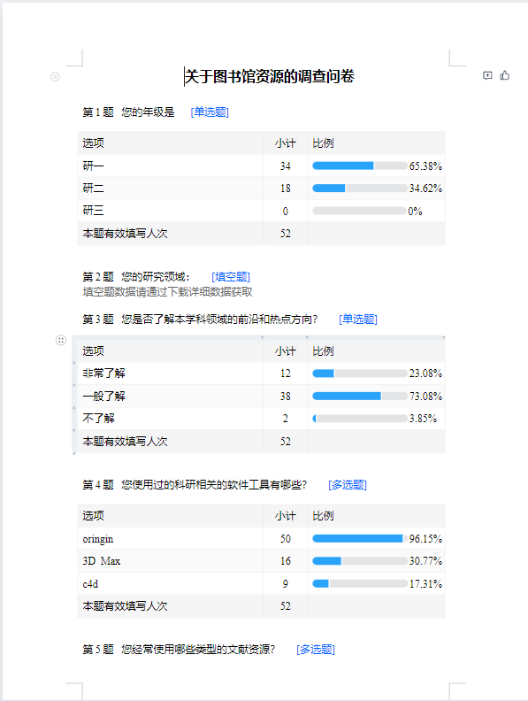 目前,调查活动已经圆满结束。初步统计和分析结果显示,大部分员工对图书馆资源有一定的了解,但在使用频率和深度上存在差异。员工们普遍认为,图书馆资源的丰富性对他们学习和研究有着重要帮助,但也提出了一些关于提高资源获取效率和提升服务质量等方面的建议。