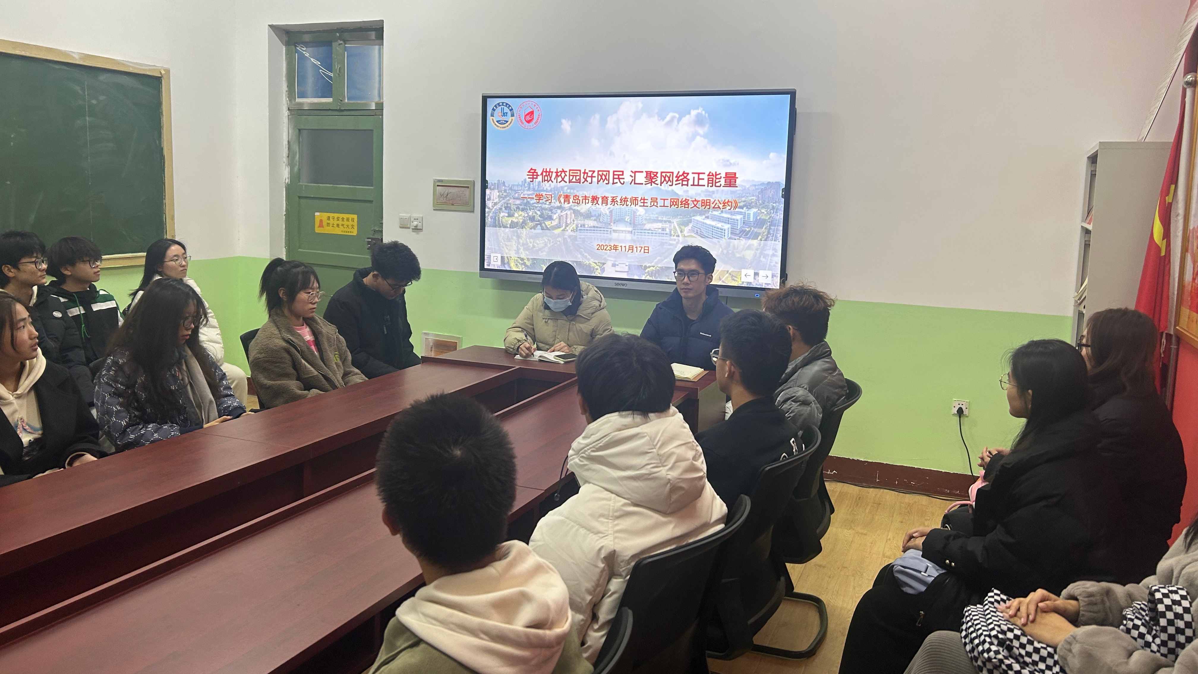 学习《青岛市教育系统师生员工网络文明公约》、开展反诈意识宣讲会,引导员工网络文明互动、理性发言表达,弘扬主旋律、传播正能量、发出“网络好声音”,不断提升员工识网、管网、用网能力,引导员工树立网络文明理念,提高员工网络媒介素养。