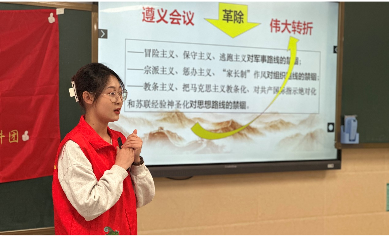主讲人刘凯昱、薛晓红将红军长征故事相关的动画视频短片作为此次宣讲的开始,生动直观的动画形式吸引了小朋友的感官,让孩子们短时间内能够集中注意力到课堂上。主讲人选取了整个遵义会议中具有代表性的故事进行讲述,遵循少儿特点,把握红色育人的时代性、趣味性和层次性,以富有童趣的语言深入浅出的讲解了遵义会议大致内容以及红军长征的艰难困苦,运用举例子的方式帮助孩子们理解遵义会议的重要意义,在孩子们心中种下了遵义会议精神的种子。