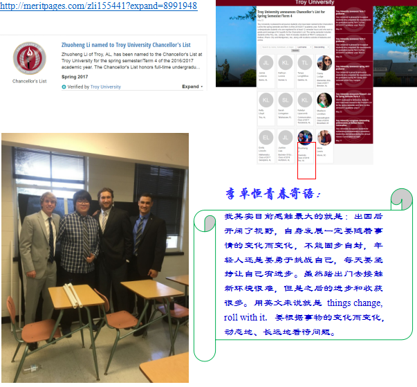 近日,从美国特洛伊(Troy)大学获悉,正在Troy大学就读的应用化学(中美)专业148班员工李卓恒因成绩优异,荣登2016-2017学年春季美国特洛伊大学董事长荣誉名单(Chancellor's Honor List)。