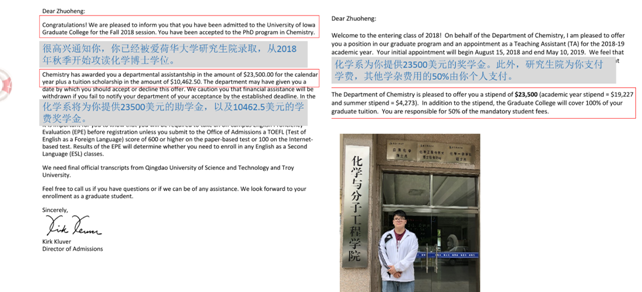 近日,应用化学(中美)专业148班员工李卓恒收到美国爱荷华大学的全奖offer,将于2018年8月份赴美攻读博士学位。