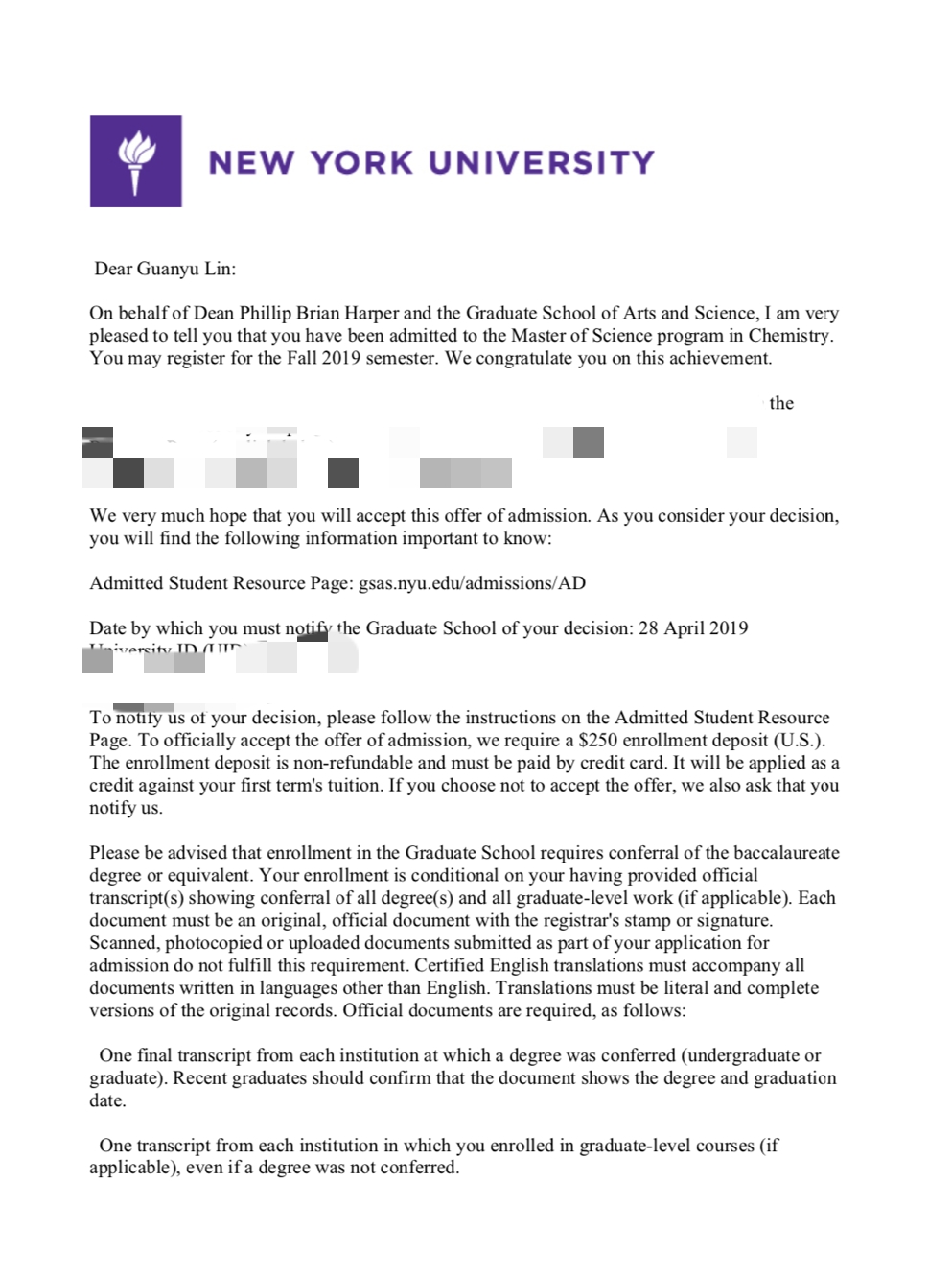 考取公司:美国纽约大学(NYU)化学理学硕士